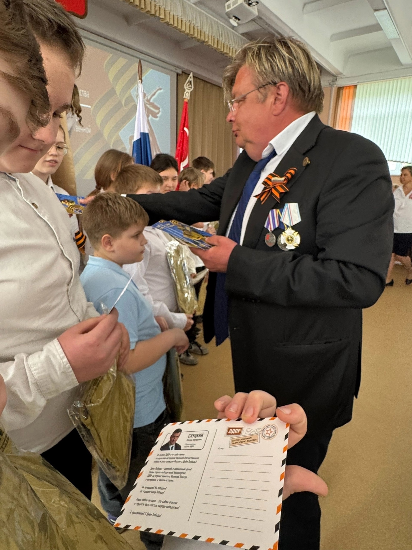 Депутат гордумы Дзержинска фракции ЛДПР Роман Шилов посетил концерт в школе №71, где вручил юным участникам торжества партийные открытки и футболки с патриотическим дизайном.