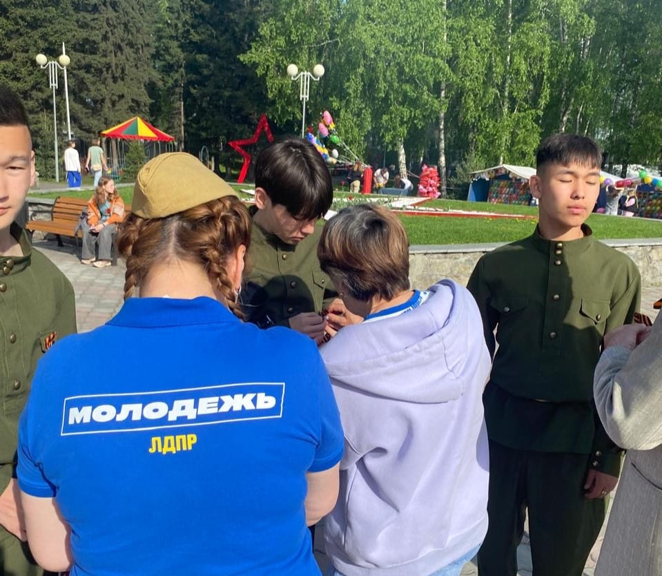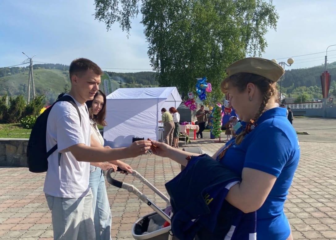Партийцы общались с единомышленниками и вручали георгиевские ленты горожанам и гостям столицы республики Алтай