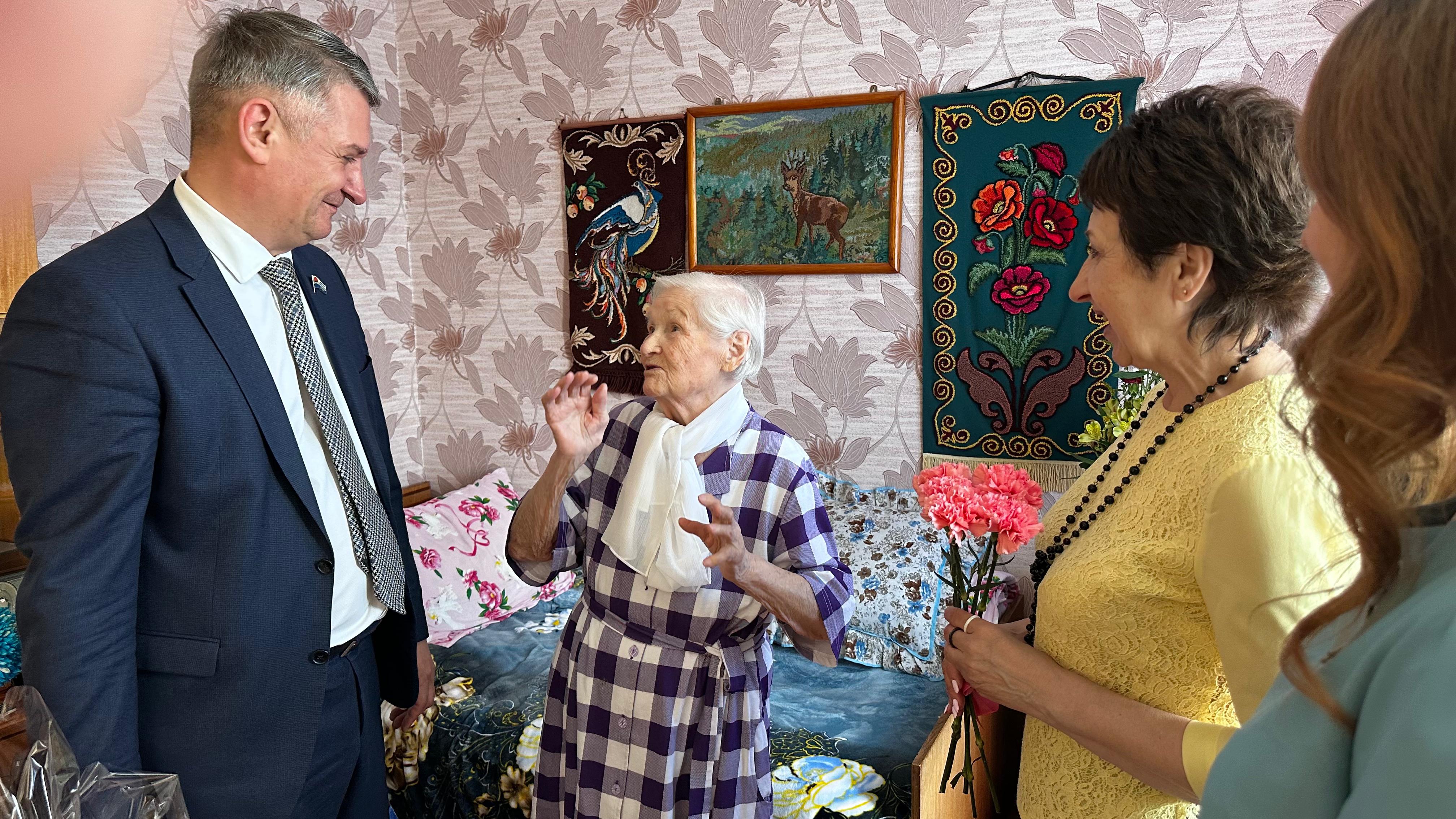 Поразила депутатов худенькая женщина с серебряными волосами в возрасте 102 лет, которая встретила гостей не только на своих ногах, но в нарядном платье и шелковом шарфике на шее. В чисто прибранной квартире – тканые картины и подушки, вышитые хозяйкой собственноручно.