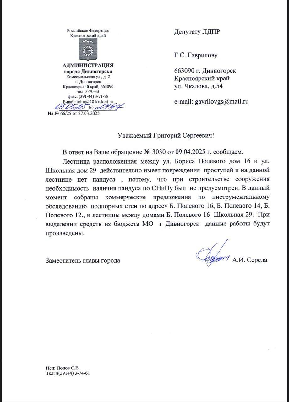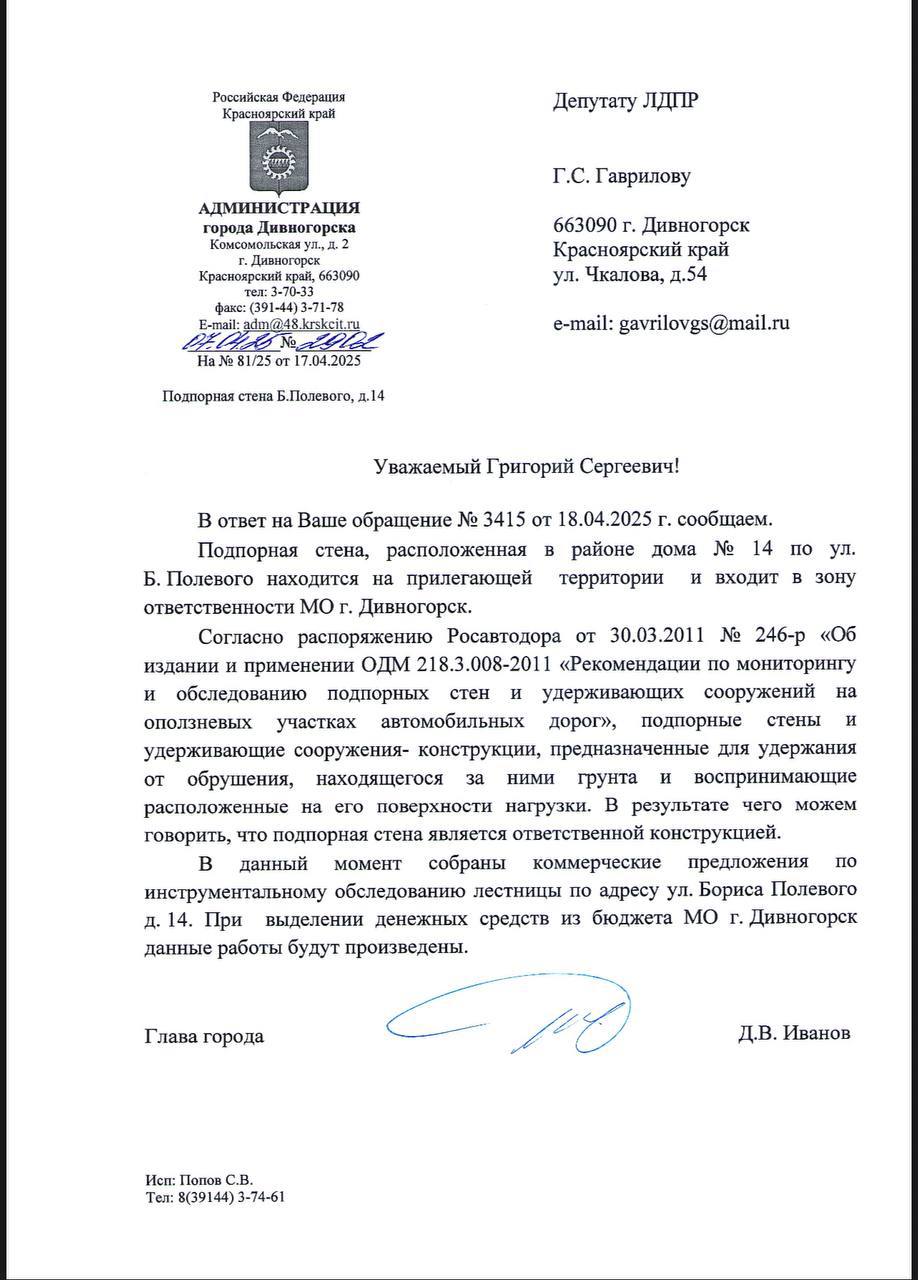 Недавно активист ЛДПР Данил Сахаров отправил запрос через старшего коллегу, депутата Григория Гаврилова по поводу состояния подпорной стены, расположенной в Дивногорске в районе дома № 14 по улице Бориса Полевого, и получил ответ — все уже просчитали, и есть несколько коммерческих предложений на обследование