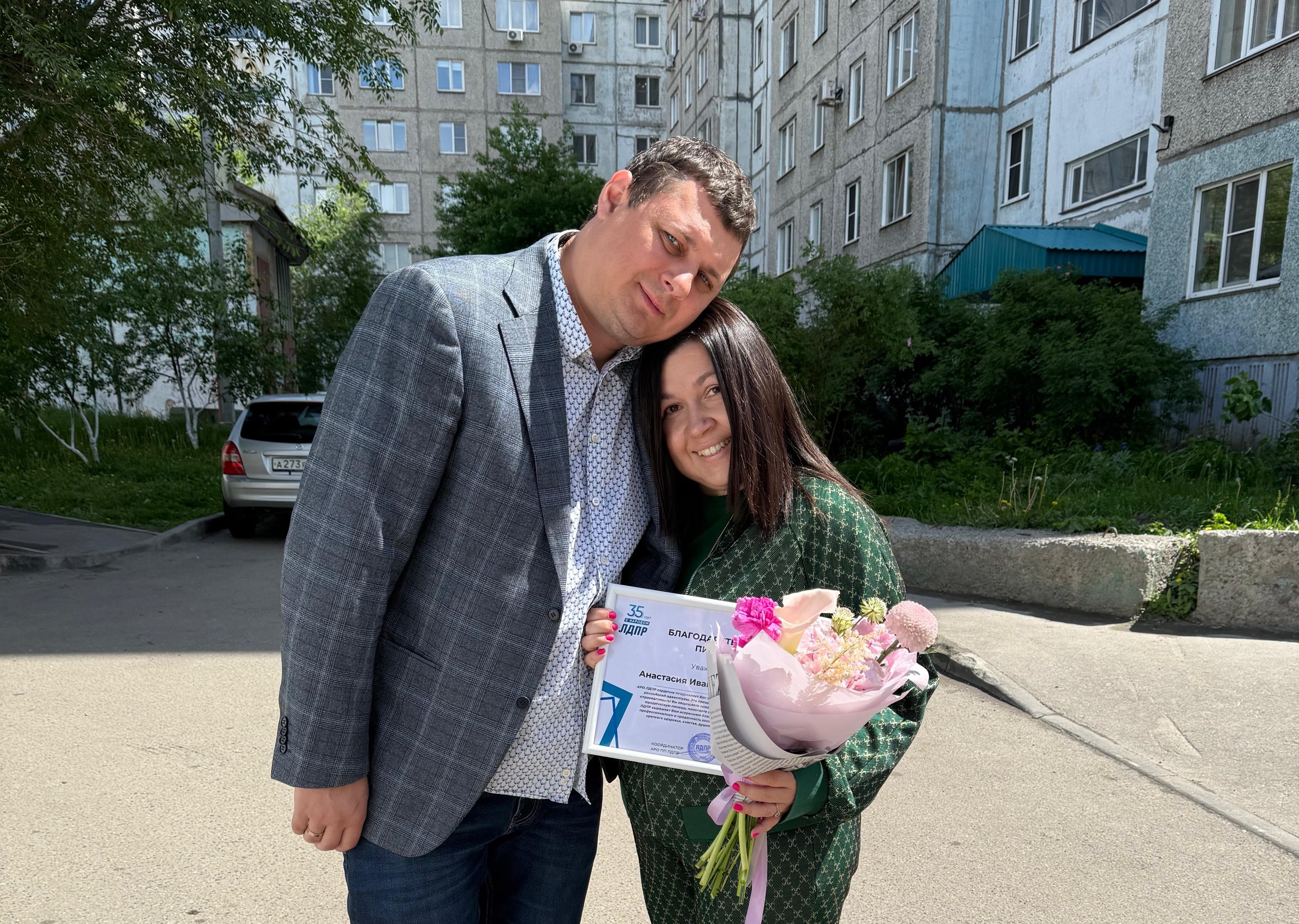 От имени партии координатор Алтайского реготделения ЛДПР Сергей Булаев вручил благодарственное письмо вице-президенту Адвокатской палаты Алтайского края Анастасии Ивановны Харламовой