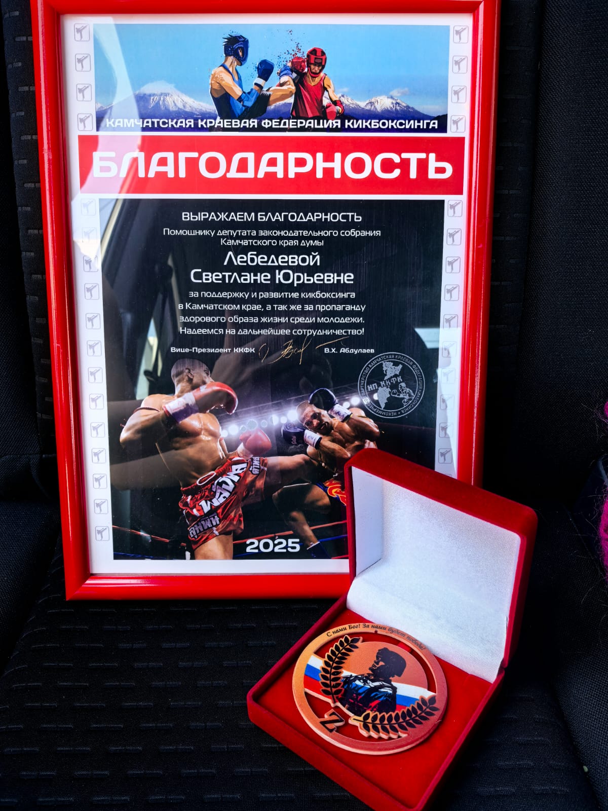 По окончании мероприятия Валерию Калашникову и Светлане Лебедевой вручили Благодарность от Камчатской краевой федерации кикбоксинга и памятные медали за поддержку СВО, развитие кикбоксинга в Камчатском крае и пропаганду здорового образа жизни среди молодёжи.