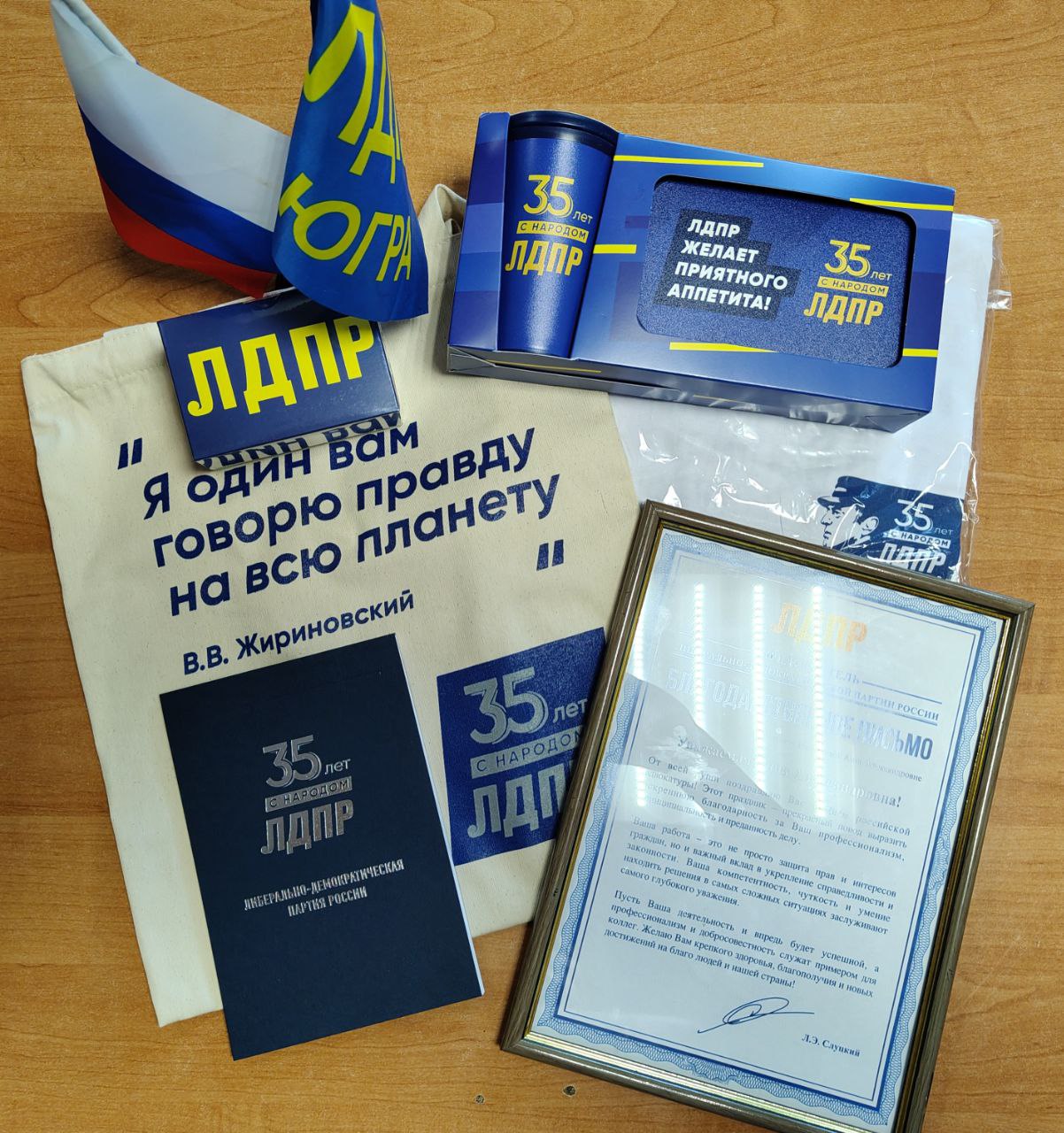 В связи с отсутствием Анны Ивленковой в городе в день праздника, поздравить ее лично удалось только сейчас. Максим Попов вручил Анне Александровне благодарственное письмо от Председателя ЛДПР Леонида Эдуардовича Слуцкого, а также памятные подарки с символикой ЛДПР.