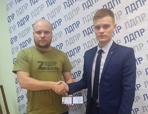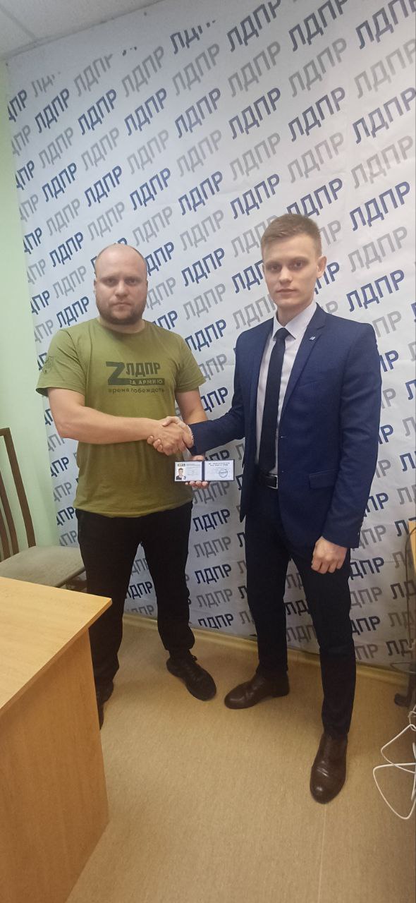 Сегодня в Ханты-Мансийске в рамках юбилейного приёма в ЛДПР координатор партии Александр Почуев вручил партийный билет новому члену партии — Дмитрию Моисееву