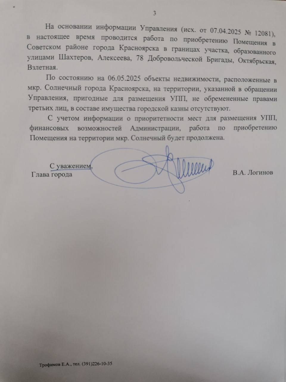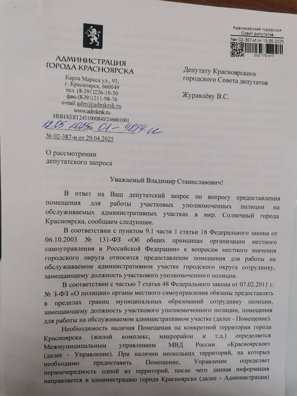 В связи с тем, что вопрос не решается длительное время, Владимир Журавлёв направил обращение в прокуратуру города по факту бездействия администрации в обеспечении полиции необходимыми помещениями.