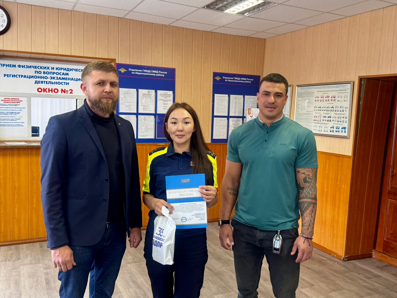 Активисты местного отделения ЛДПР поздравили коллектив Отдела ГИБДД ОМВД России по Нерюнгринскому району: Базарова Баира, старшего гос. инспектора; Савенкова Андрея, старшего государственного инспектора; Андросову Анну, государственного инспектора; Гладышева Марка, государственного инспектора; Попова Виктора, заместителя начальника; Слепцова Иннокентия начальника; и Тимченко Антона, государственного инспектора.