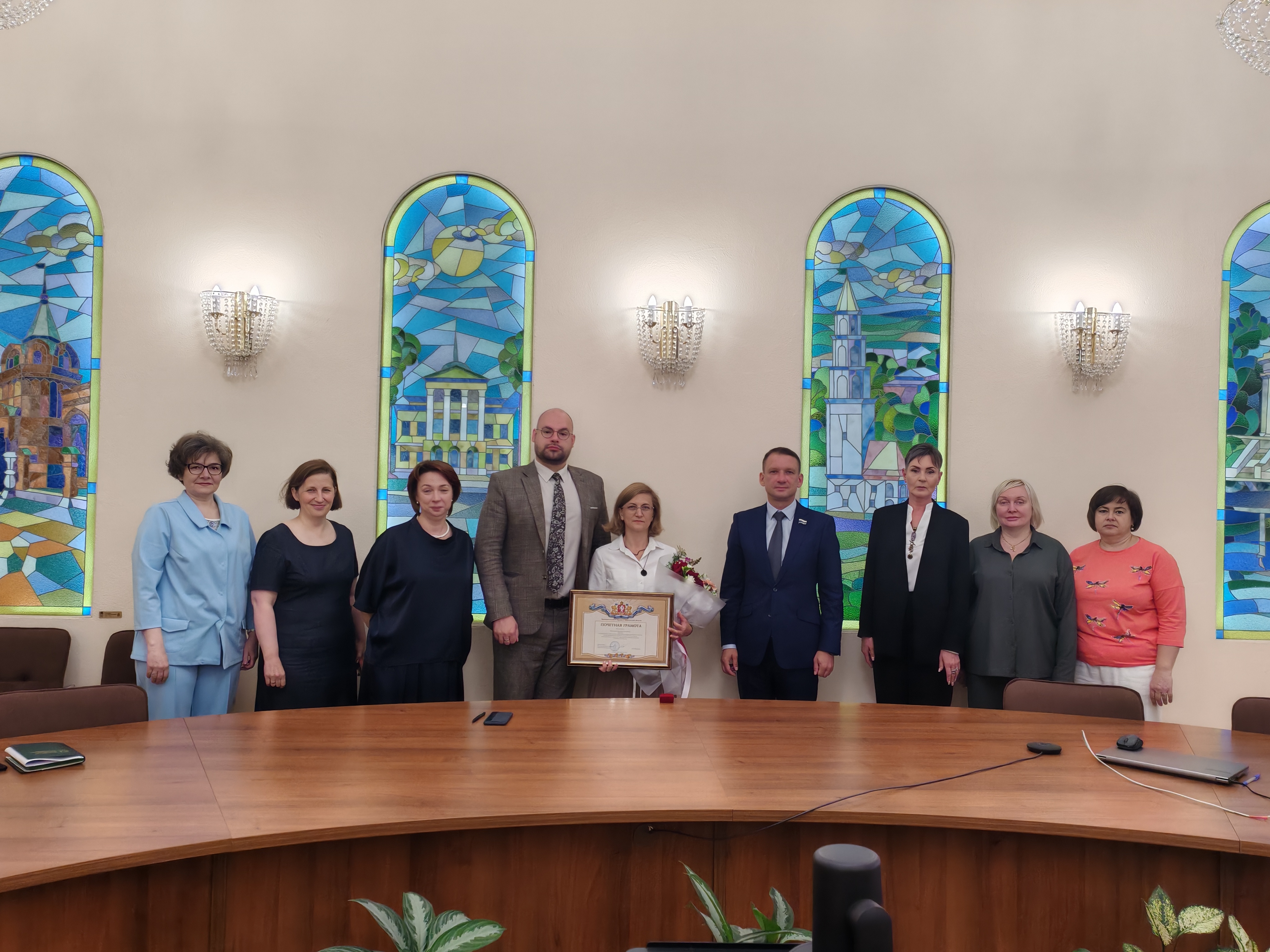 В торжественной обстановке депутат Александр Каптюг вручил Почетную грамоту Законодательного Собрания Свердловской области директору Центра традиционной народной культуры Среднего Урала Виктории Новопашиной за вклад в сохранение национально-культурных традиций.