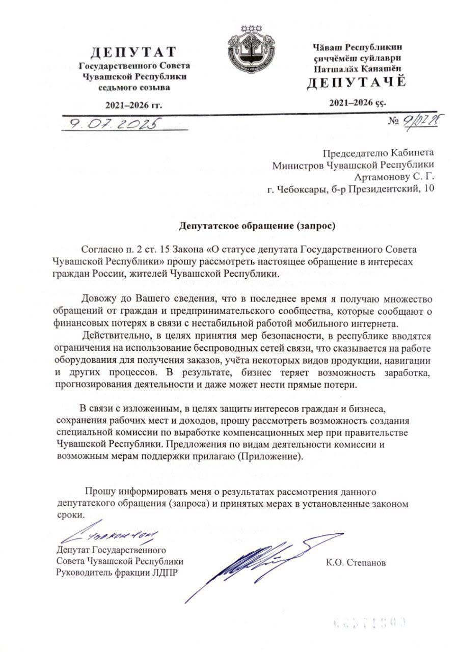 Депутат Госсовета Чувашии от ЛДПР Константин Степанов поднял вопрос о необходимости защиты предпринимателей республики от ущерба, вызванного периодическими отключениями мобильного интернета. Эти сбои связаны с мерами обеспечения безопасности на фоне режима беспилотной опасности