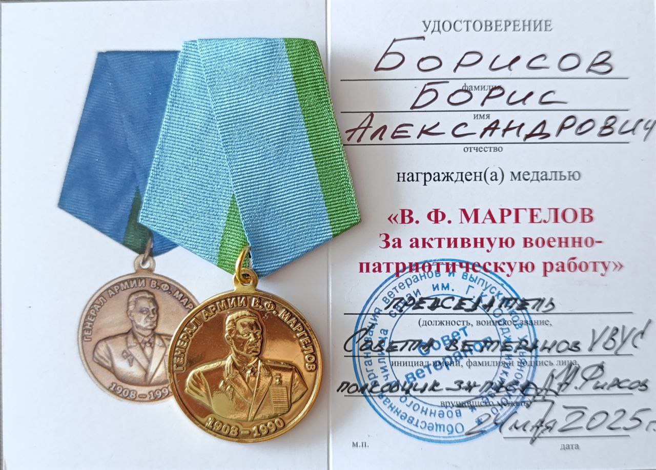 Борис Александрович Борисов, депутат Совета депутатов Красноярского сельского поселения Чердаклинского района Ульяновской области и руководитель академии смешанных единоборств «BORISOV Fight Academy», награжден медалью имени В.Ф. Маргелова за его активную деятельность в сфере военно-патриотического воспитания