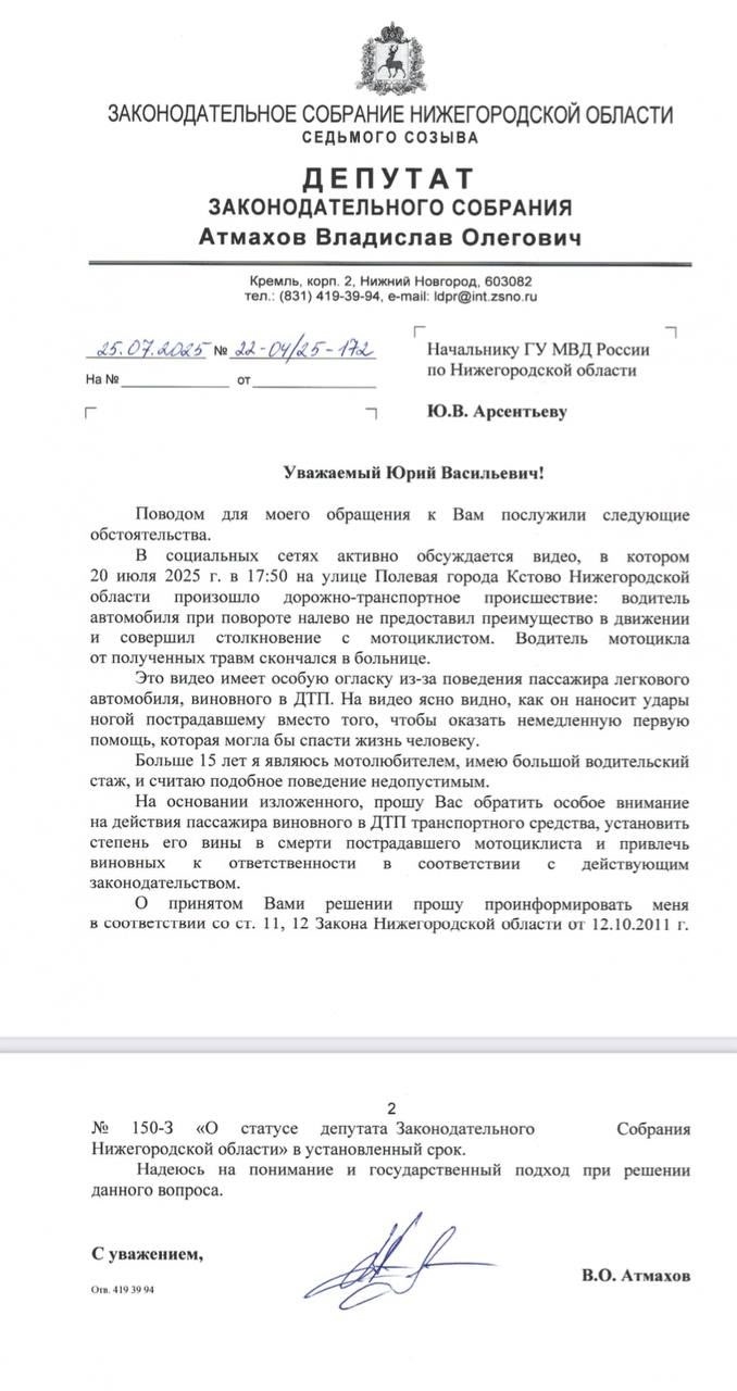 «Написал депутатский запрос в ГУ МВД России по Нижегородской области с просьбой обратить внимание на действия пассажира авто, избивавшего байкера, установить степень его ответственности в смерти мотоциклиста и привлечь виновных к ответственности. Крайне возмущён произошедшим. Дорога непредсказуема, но когда халатность или грубые нарушения ПДД приводят к трагедиям – это уже не случайность, а преступная беспечность. Беру это ситуацию на контроль», - отметил политик.