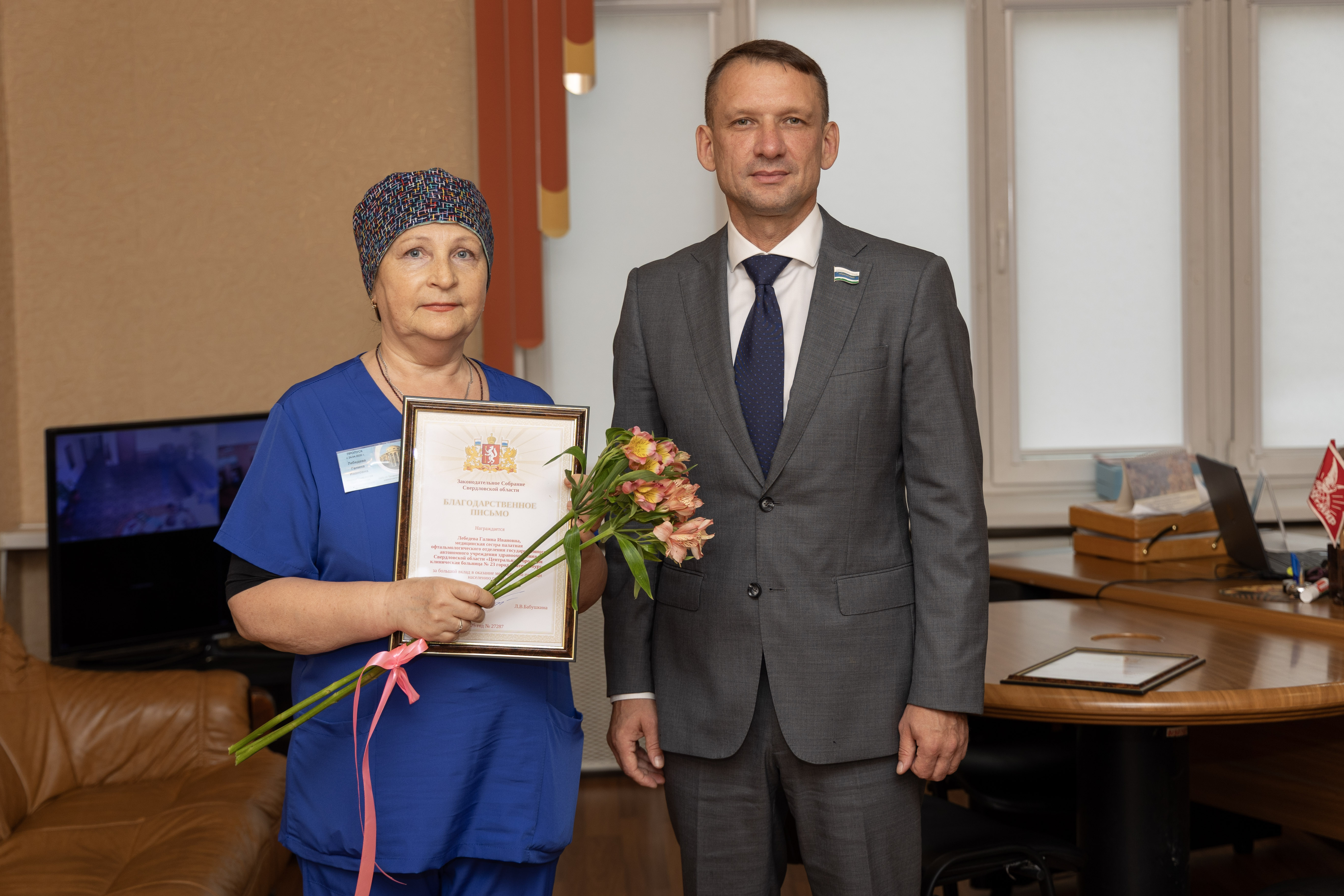 Координатор Свердловского регионального отделения ЛДПР, депутат Законодательного Собрания Свердловской области Александр Каптюг посетил Центральную городскую клиническую больницу № 23, где ознакомился с работой больницы и вручил награды сотрудникам за их вклад в здравоохранение