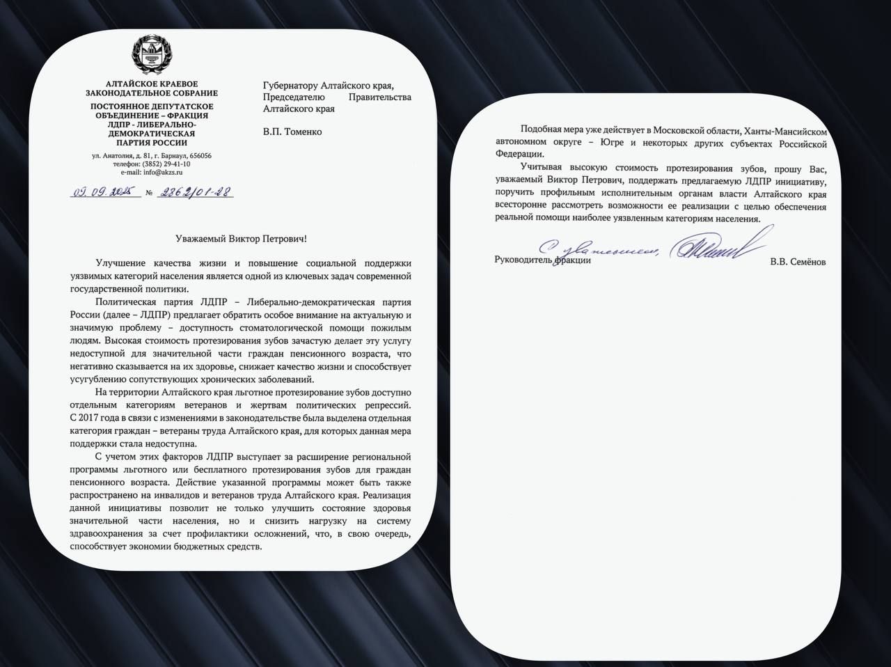 Расширить программу льготного протезирования зубов для пенсионеров Алтайского края предлагают депутаты ЛДПР