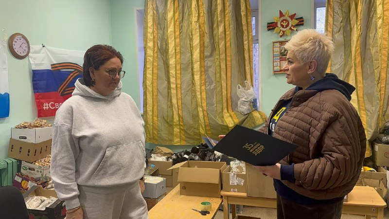 Евгения Нурулина и Ольга Шагина продемонстрировали гуманитарные сборы, готовящиеся к отправке, и также вручили символические подарки — кому именно они достанутся, активисты обещают рассказать совсем скоро.