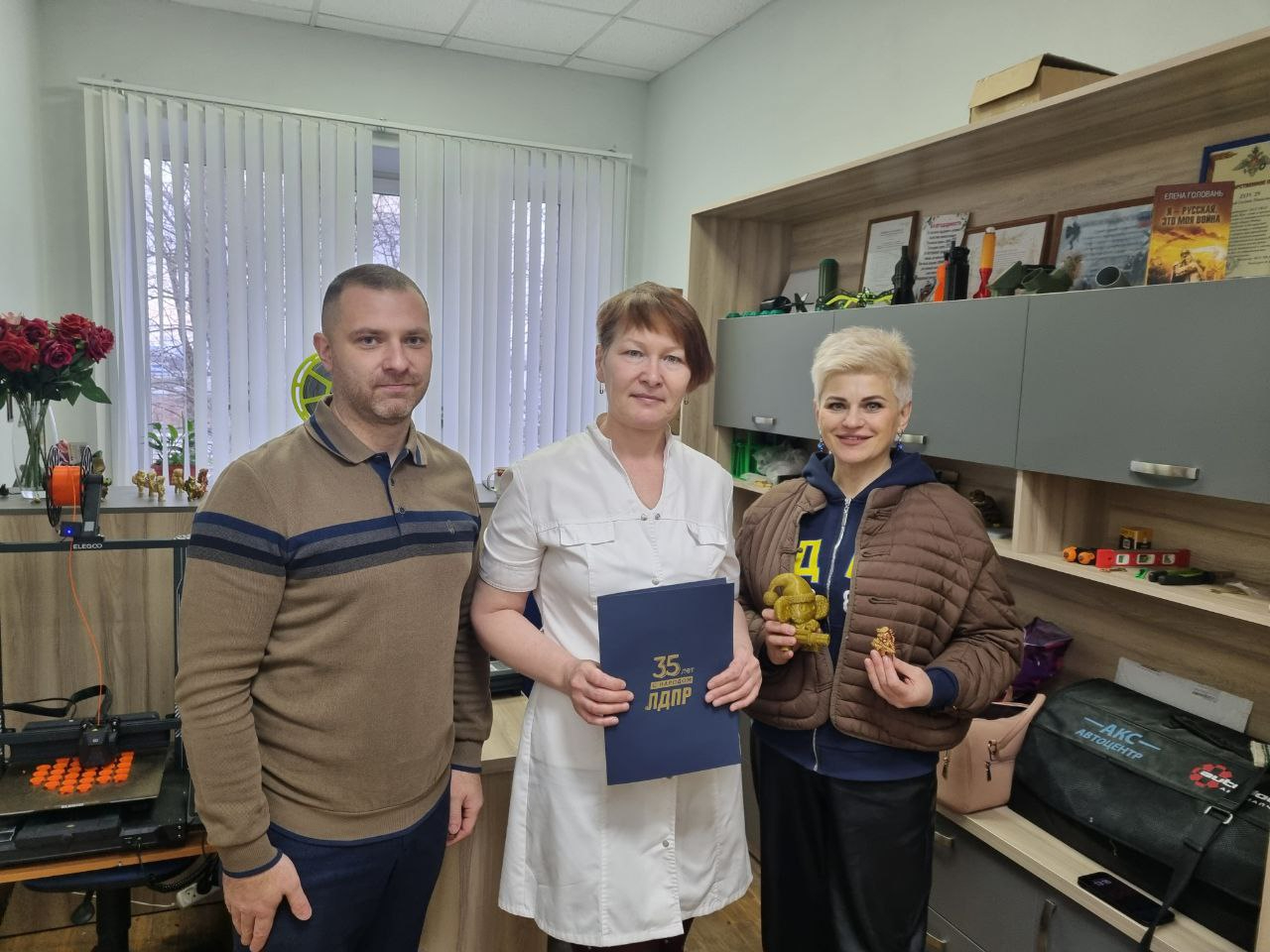 Особое внимание привлекла работа Галины Журиной, которая на 3D-принтере изготавливает необходимые детали для коптеров. Она также передала два памятных сувенира для бойцов, с которыми представители ЛДПР скоро лично встретятся на передовой.