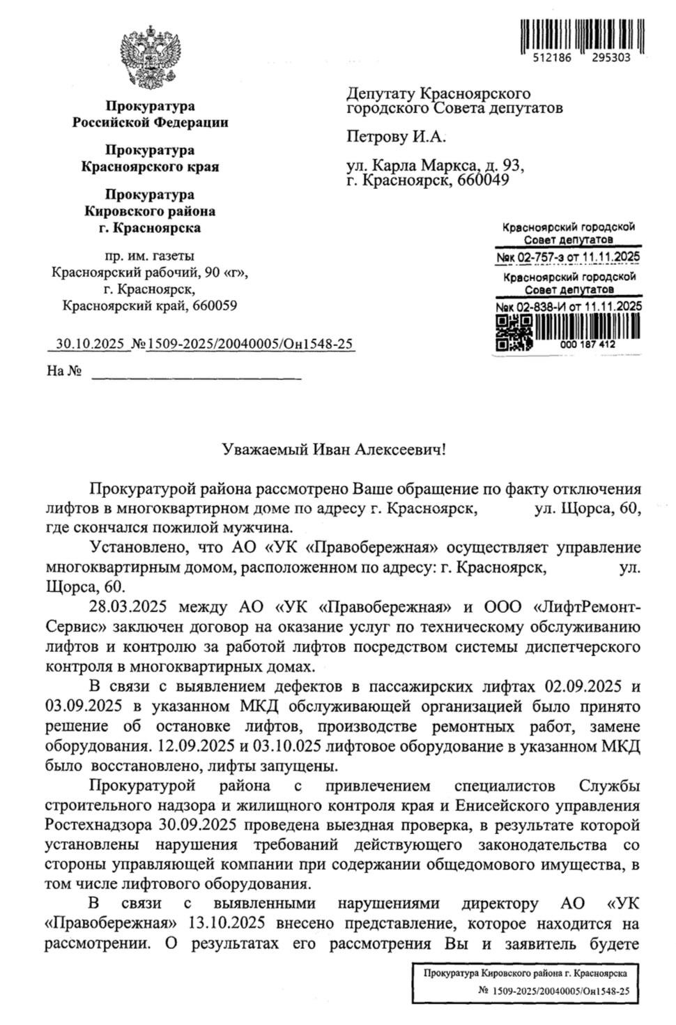 Иван Петров написал по этому поводу заявление в прокуратуру и попросил проверить работу УК. В своем телеграм-канале депутат сообщил, что прокуратура провела проверку. Вместе с другими надзорными ведомствами сотрудники прокуратуры выяснили, что договор на обслуживание лифтов заключили еще в марте. В сентябре они сломались, их ремонтировали больше 10 дней.