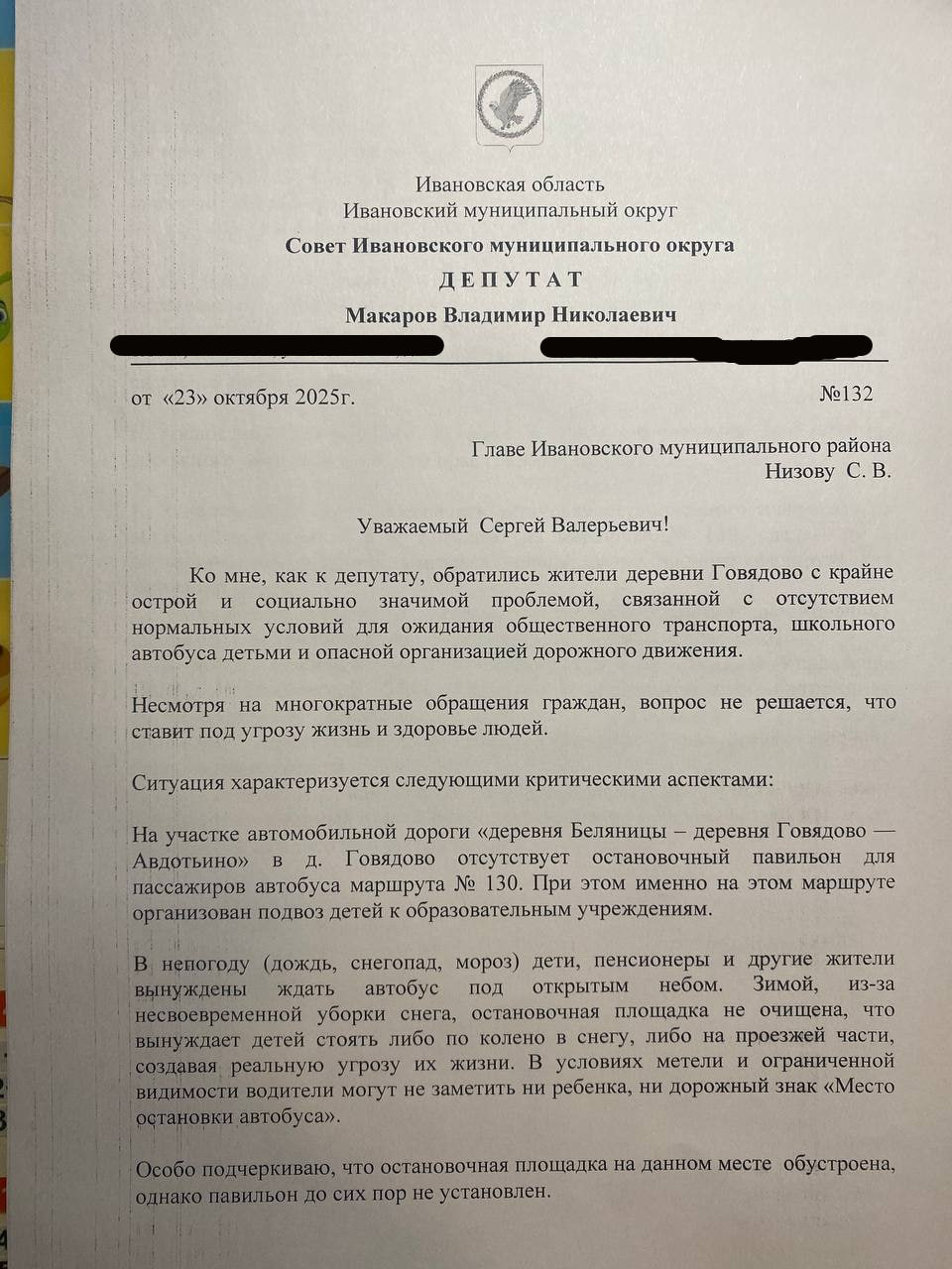 По коллективному обращению жителей деревни Говядово депутат от ЛДПР Ивановского муниципального округа Владимир Макаров направил официальный запрос в администрацию района. Люди справедливо обеспокоены сложившейся ситуацией: возле дороги, по которой ежедневно ездят школьники, нет элементарных условий безопасности.Необходимо установить остановочный павильон на маршруте №130, которым пользуются дети, оборудовать павильонами остановки маршрута №103, а также обратиться в ГИБДД с просьбой об установке «лежачего полицейского» на пешеходном переходе.