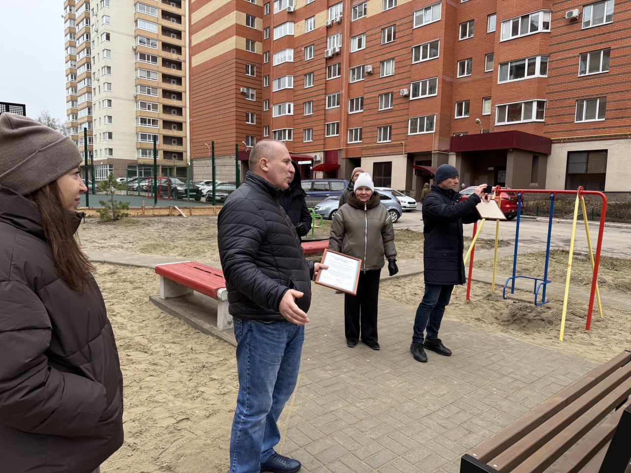 Руководитель фракции ЛДПР Дмитрий Грачев вместе с коллегами-депутатами Сергеем Кочергиным и Маратом Бакеевым принял участие в проверке готовности благоустроенного двора на Луначарского, 23В и 23В, корпус 1.