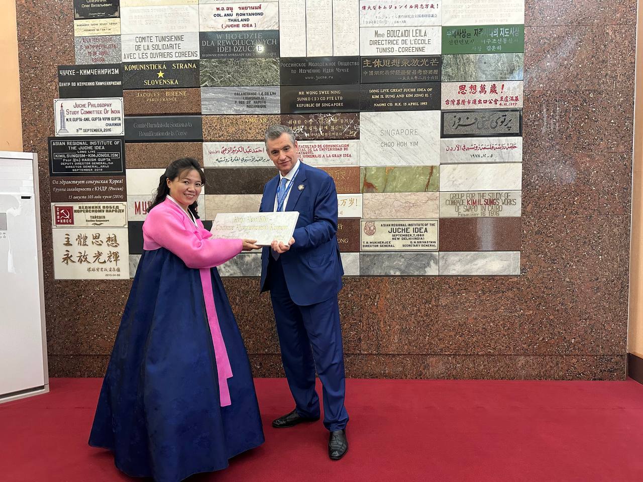 В знак крепкой дружбы между ЛДПР и КНДР Леонид Слуцкий передал в дар памятную каменную плиту с надписью «Ким Чен Ын Солнце Чучхейской Кореи». Эта табличка будет установлена на стене Монумента идей чучхе, где размещены подарки от высокопоставленных гостей со всего мира.