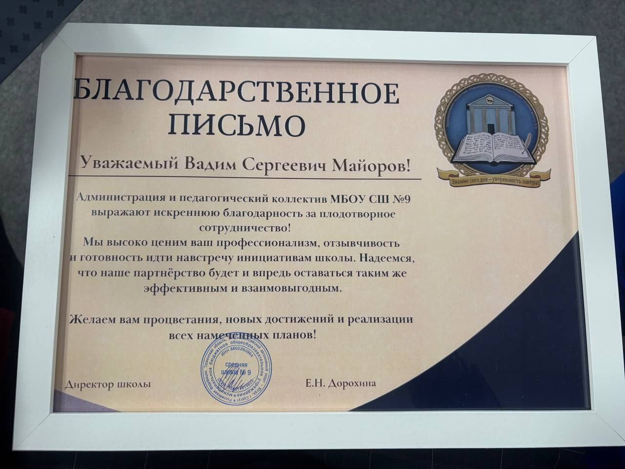 «Школа №9 — яркий пример успешного современного образовательного учреждения, которое с годами только растет и крепнет. Отрадно видеть, как преображаются ее корпуса, оснащаются классы, с каким энтузиазмом работают педагоги. Для меня большая честь вносить свой посильный вклад в это важное общее дело и общаться с педагогами и родителями по вопросам качества образования», — отметил Вадим Майоров.