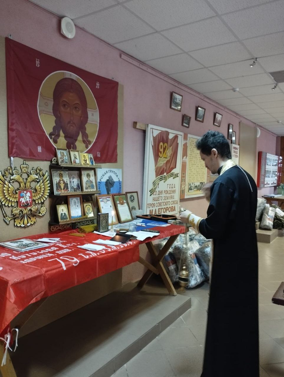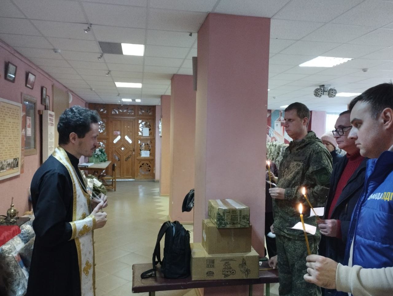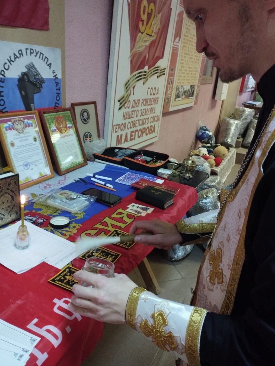 В стенах штаба, который был создан силами неравнодушных жителей, клирик храма святого Георгия Победоносца иерей Виталий Губин по приглашению волонтеров помолился о здравии воинов и добровольцев. Также он провел литию в память о погибших бойцах. Отец Виталий освятил партию шевронов для будущей отправки на фронт.