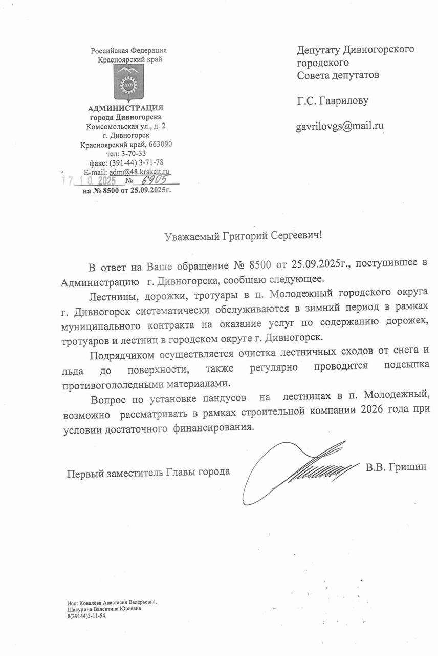 Ранее народный избранник получил ответ администрации Дивногорска на обращение, которое он отправлял ещё до наступления зимы по вопросу состояния лестниц в поселке Молодёжный. Напомним, жители неоднократно жаловались на скользкие ступени, отсутствие своевременной уборки и риск травм.