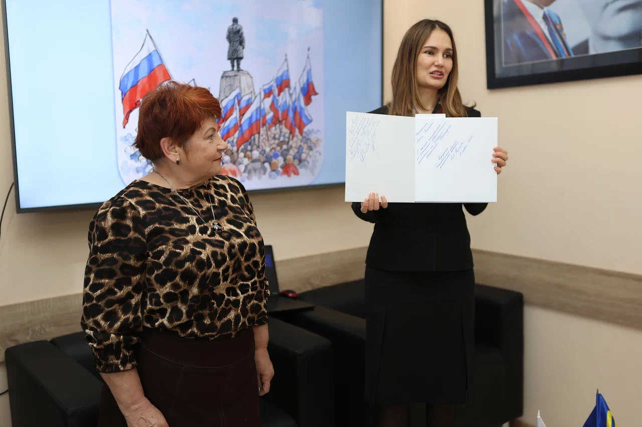 Книгу из рук Нины Фаустовой получила член Севастопольского отделения ЛДПР, член избирательной комиссии с правом решающего голоса Лариса Бусыгина. Она сама стояла у истоков тех событий. В 2014 году работала в избирательной комиссии, не спала ночами, помогала организовывать голосование в рекордно сжатые сроки. Книга, которую ей вручили, — часть ее собственной жизни. Момент получился по-настоящему трогательным и душевным.