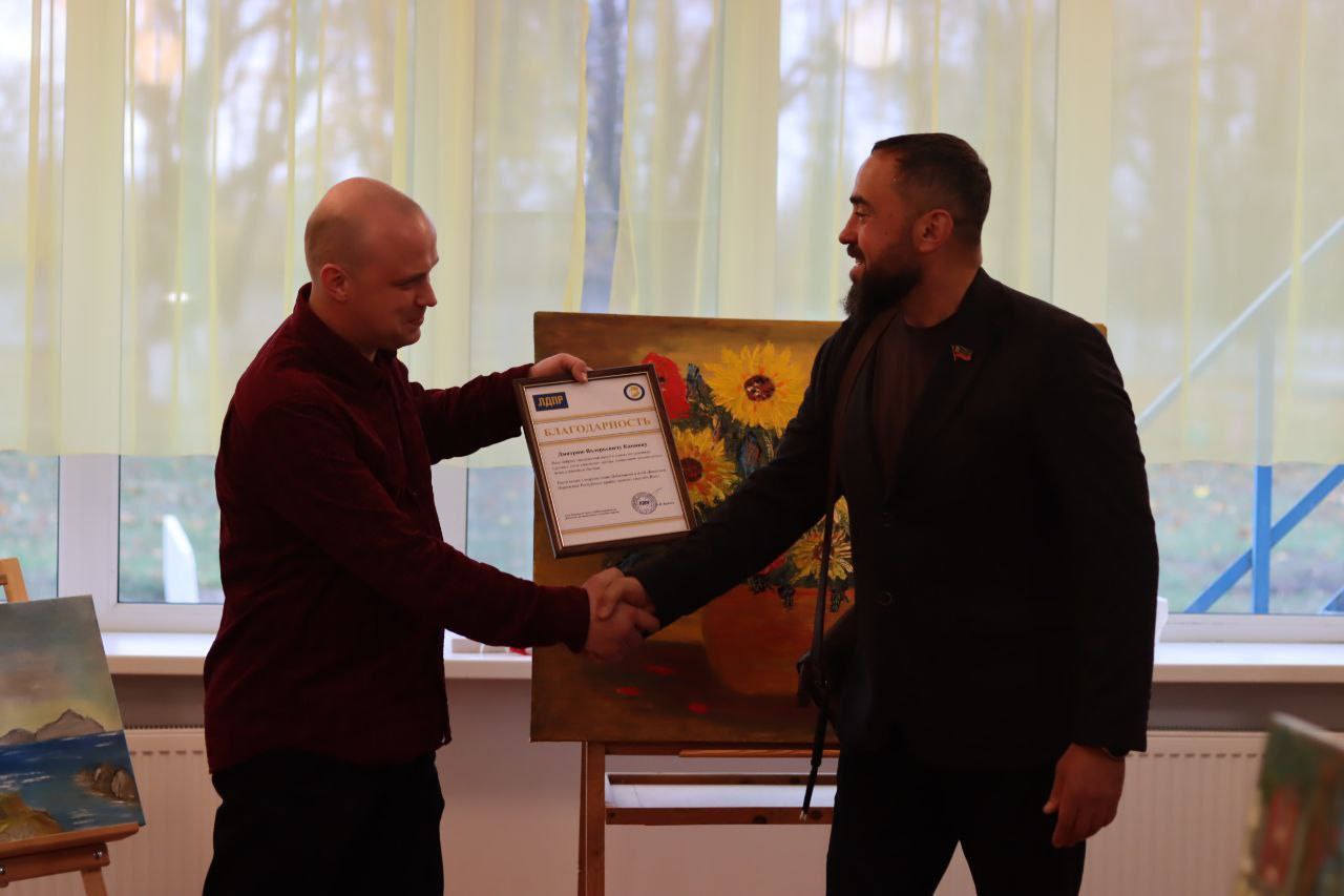 В знак признания его вклада не только в развитие культуры, но и в общественно-политическую жизнь региона, Дмитрий Другашов вручил художнику благодарственное письмо от координатора Донецкого регионального отделения Андрея Крамара.