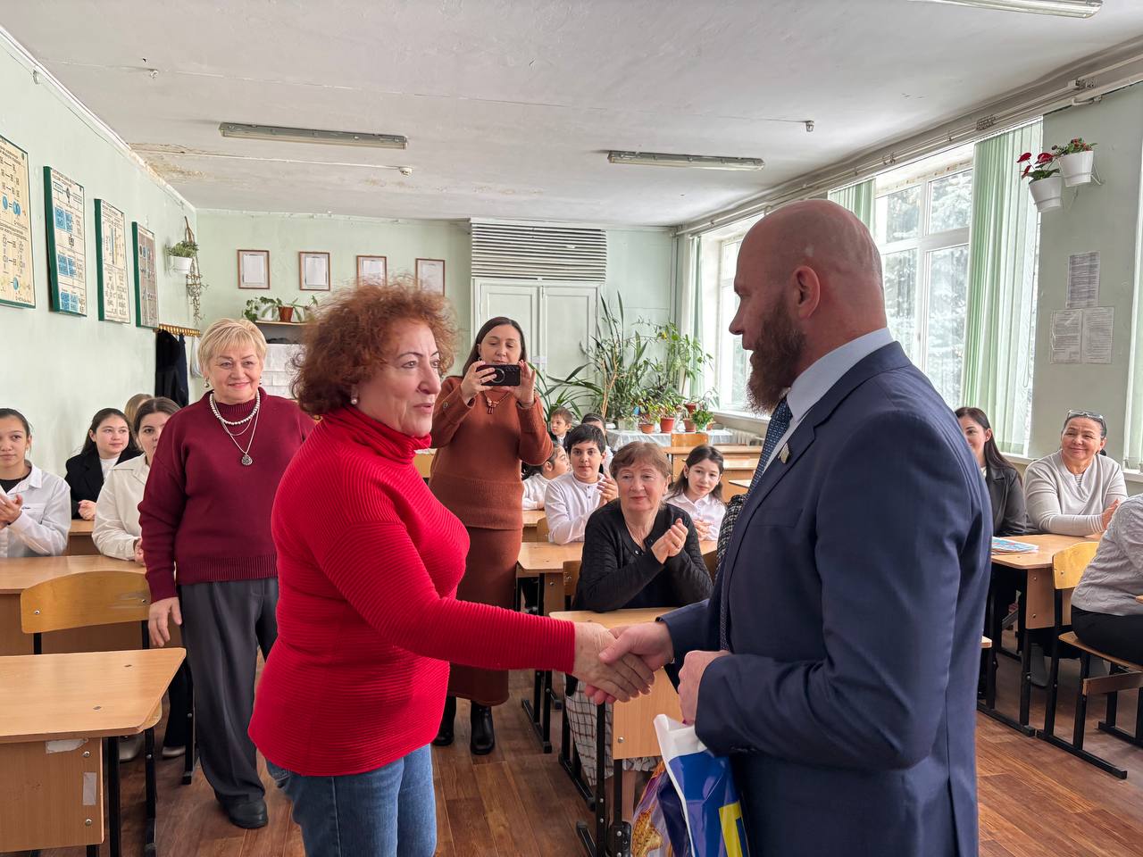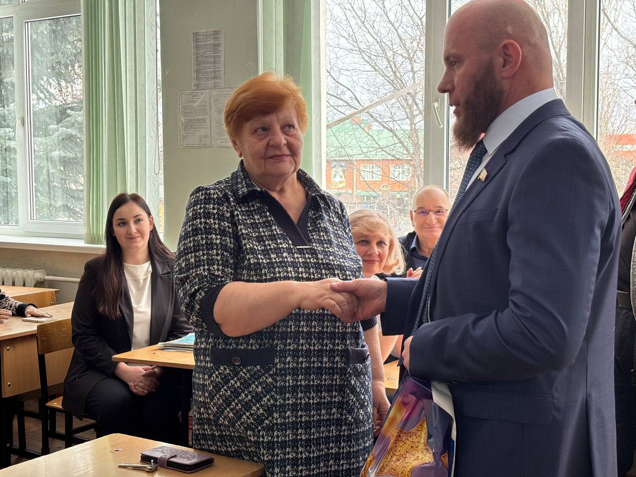 Поздравления продолжились в гимназии № 17, где чествовали пятерых учителей ветеранов. Среди них были и педагоги депутата городской Думы Черкесска Олега Кротова. К некоторым учителям депутаты приехали лично домой, чтобы поздравить с наступающим праздником, поблагодарить за многолетний труд и уделить внимание.