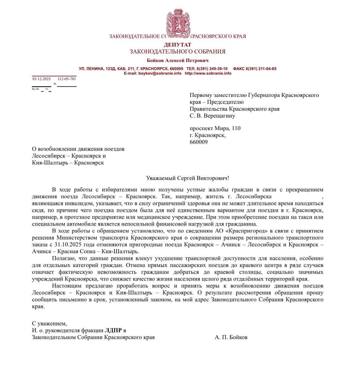 После отмены с 31 октября прямого пригородного поезда Лесосибирск – Красноярск к руководителю фракции ЛДПР в Заксобрании края Алексею Бойкову обратились жители Енисейского муниципального округа. Для многих это не просто неудобство — это критически важный вид транспорта, которым пользовались люди с ограниченными возможностями передвижения, студенты, пожилые люди