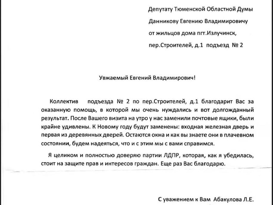 Жители Ханты-Мансийского автономного округа всё чаще обращаются в ЛДПР не только за поддержкой, но и с искренними словами благодарности за уже оказанную помощь. Одним из таких примеров стала история жильцов дома № 1 по переулку Строителей в посёлке Излучинск, которые поблагодарили депутата Тюменской областной Думы, координатора ЛДПР в Югре Евгения Данникова за реальные изменения в их доме.