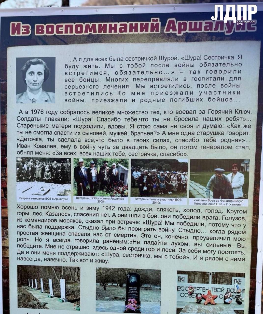 Во времена Великой Отечественной войны здесь размещался военный госпиталь. После войны на месте братских могил был создан мемориальный комплекс - символ памяти и благодарности нашим героям. Долгие годы за могилами ухаживала местная жительница Аршалуйс Ханжиян. Её память увековечена неподалёку, как напоминание о бескорыстной преданности и любви к Родине.