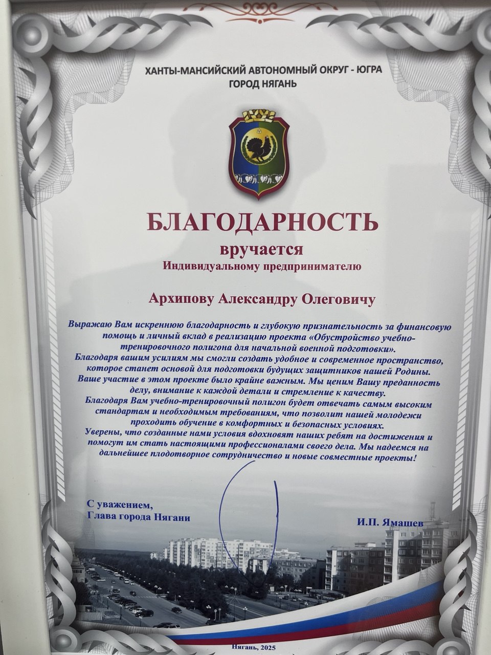 Партийца Архипова поблагодарили за помощь с обустройством учебно-тренировочного полигона для НВП в Нягани