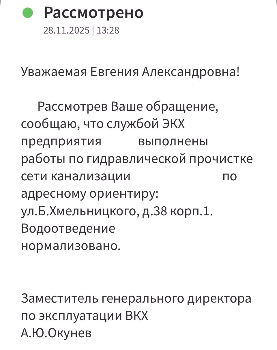 После вмешательства координатора Советского первичного отделения ЛДПР Евгении Тимошиной водоотведение на ул. Б. Хмельницкого, 38 к. 1 нормализовано.