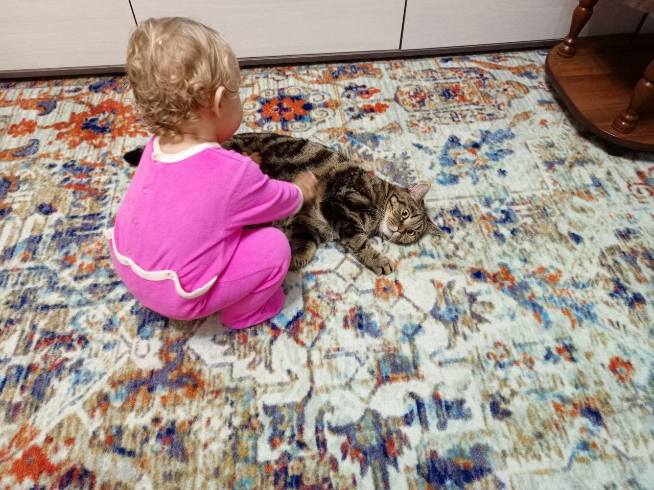 Маня поселилась у Лыковых 4,5 года назад. А когда семья готовилась к пополнению, кошку отправили погостить к свекрови. Там она подружилась с вислоухим Филей, после чего принесла потомство: пятерых котят. Так в доме появился детский сад. Котят потом пристроили, кошку стерилизовали, но материнский инстинкт у Мани остался. И своенравная свободолюбивая британка отдает свое тепло дочке Лыковых: охраняет ее сон, играет и любит как родную.