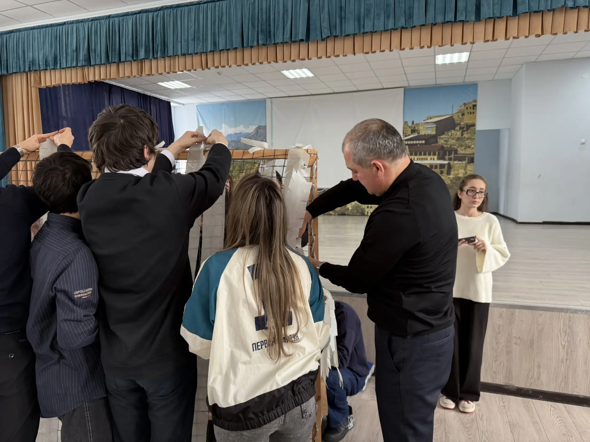 Гости не только присутствовали на открытии, но и сразу включились в работу, проведя для учащихся и педагогов подробный мастер-класс по технологии плетения маскировочных сетей.