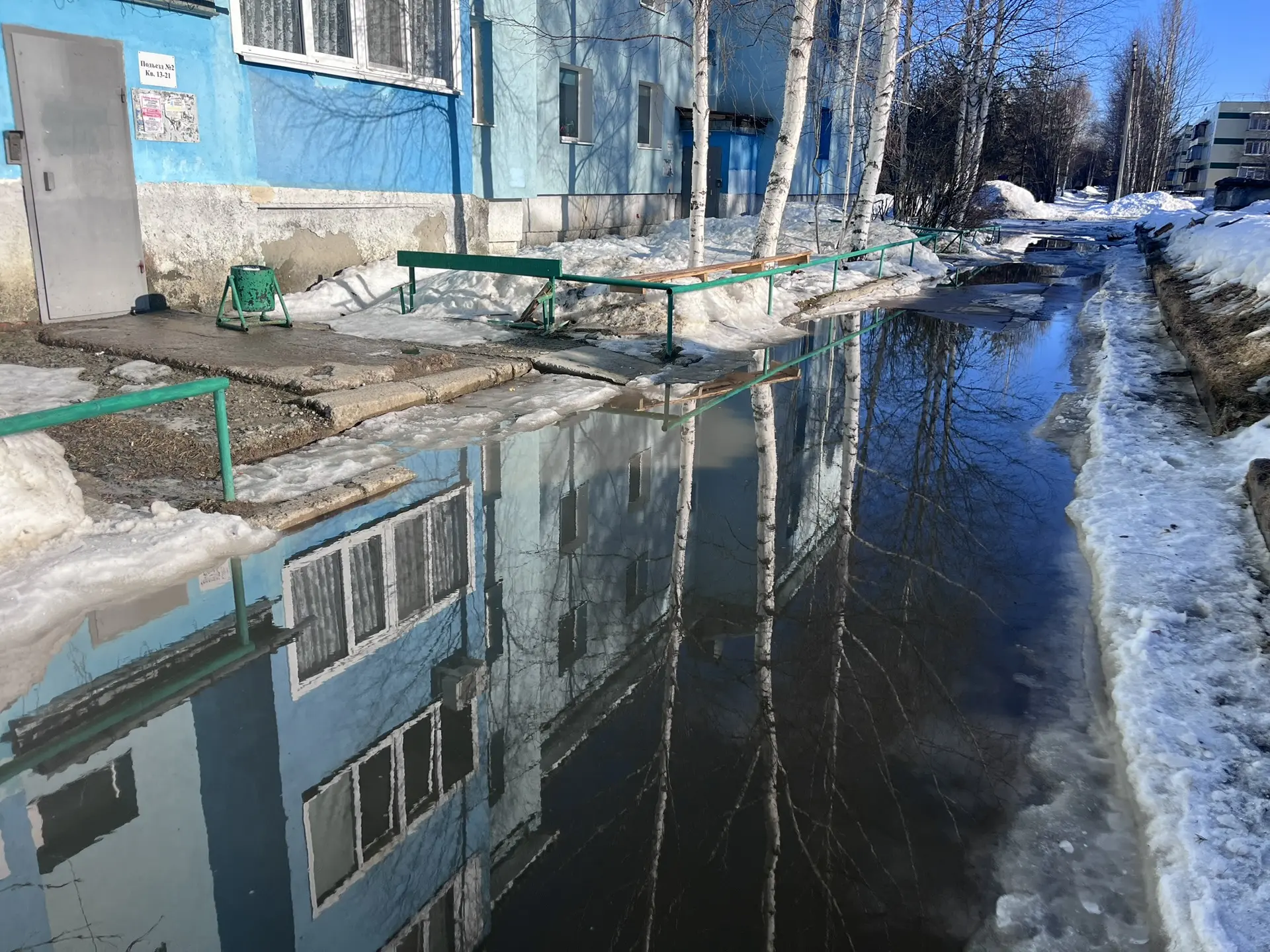 По словам жителей, каждую весну ситуация повторяется: талые воды затапливают придомовую территорию, делая невозможным нормальный выход из подъезда. Единственный способ покинуть дом – переобуваться в резиновые сапоги или преодолевать водное препятствие по сомнительным настилам.