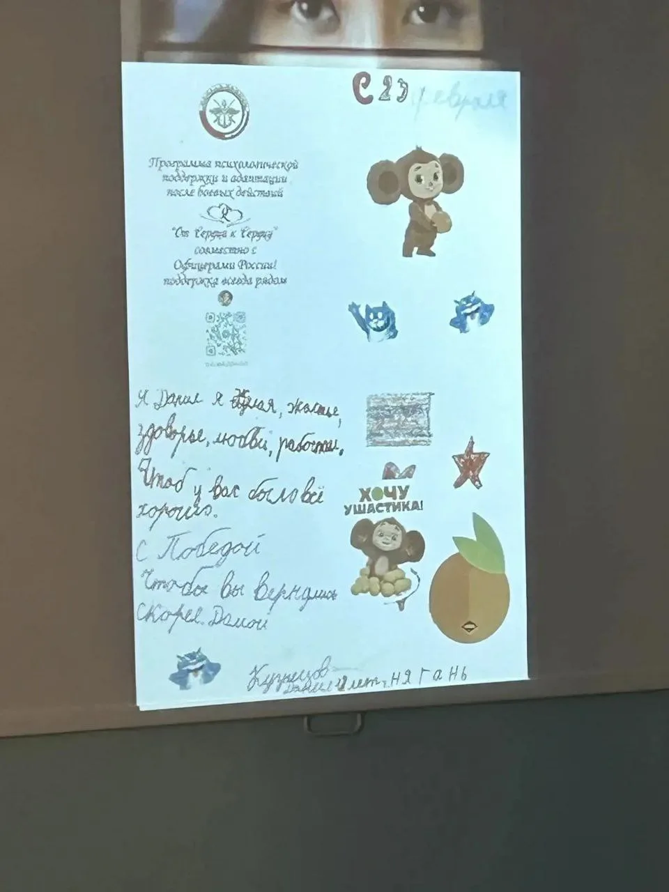 Ранее школьники своими руками рисовали открытки и писали поздравления ко Дню защитника Отечества, обращаясь к югорским солдатам с искренними словами поддержки и благодарности. Эти детские послания были переданы бойцам вместе с поздравительным видеороликом, который помогли смонтировать активисты ЛДПР. Ответ не заставил себя ждать: защитники Отечества записали для ребят благодарственное видео с тёплыми словами и пожеланиями.
